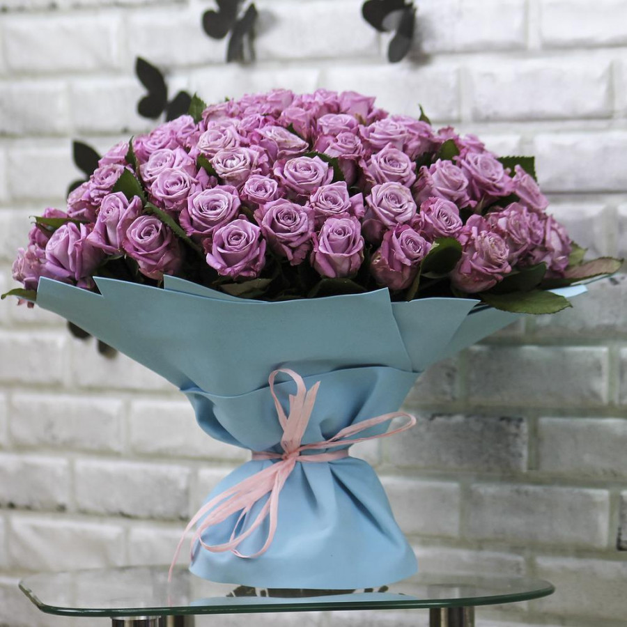 На фото букет из 101 фиолетовой розы. В составе: роза 101 шт, фоамиран 2 шт, атласная лента 1 шт, . Все цветы свежие и ароматные, букет красиво оформлен и отлично подходит для подарка. Доступна доставка цветов или самовывоз.