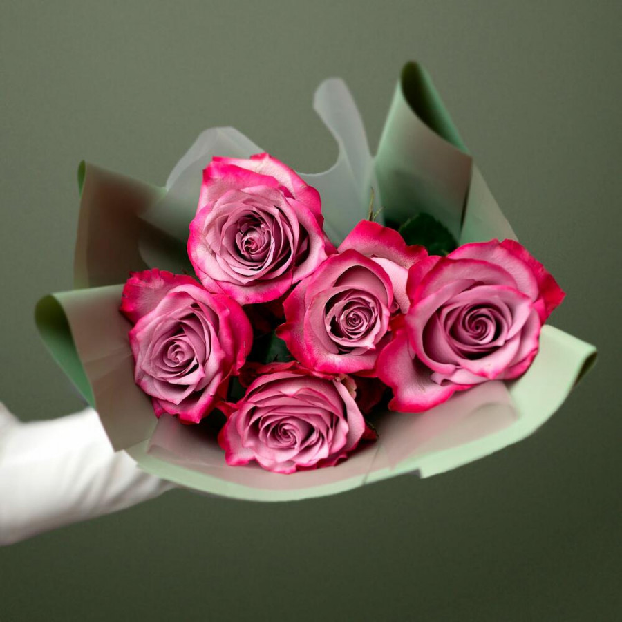 На фото букет из 5 фиолетовых роз. В составе: роза 5 шт, дизайнерская упаковка 1 шт, атласная лента 1 шт, . Все цветы свежие и ароматные, букет красиво оформлен и отлично подходит для подарка. Доступна доставка цветов или самовывоз.